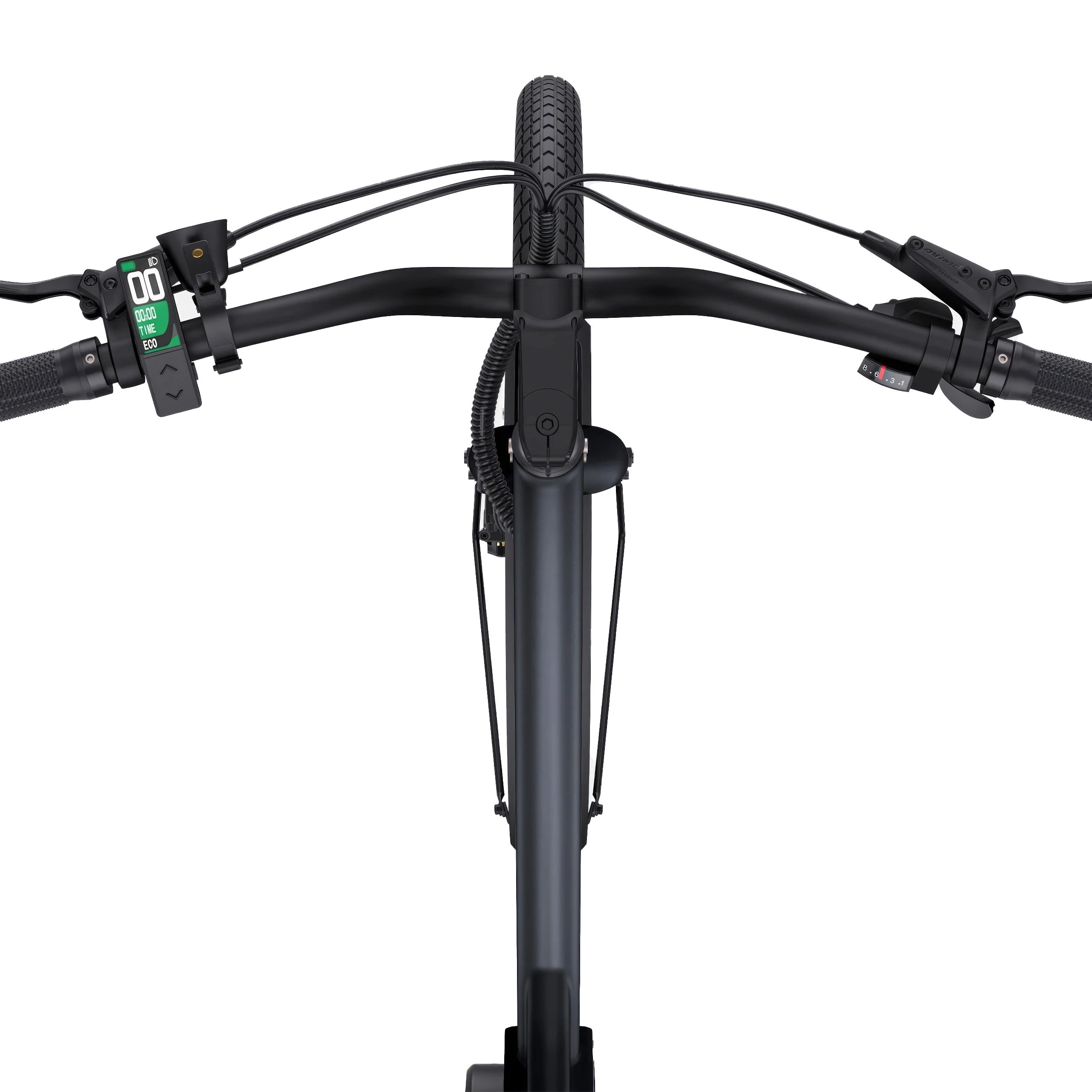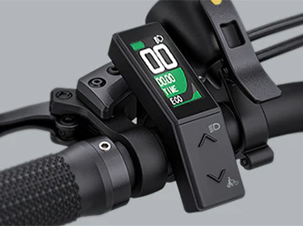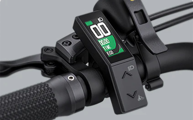 The electric bike comes with sturdy alloy mudguards, a heavy-duty rear rack, and integrated front lighting (plus a battery-powered rear light). The LCD display by the left thumb controls four power levels. Tektro hydraulic disc brakes provide reliable stopping power.