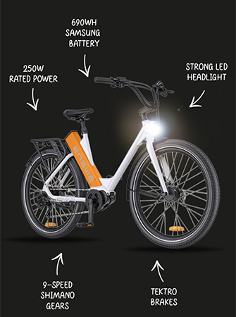 The step-through frame ensures easy mounting and dismounting, making it ideal for riders of all ages. The wide cow-horn handlebars, upright riding position, and comfortable saddle provide a stable and enjoyable commuting experience, even on longer rides.